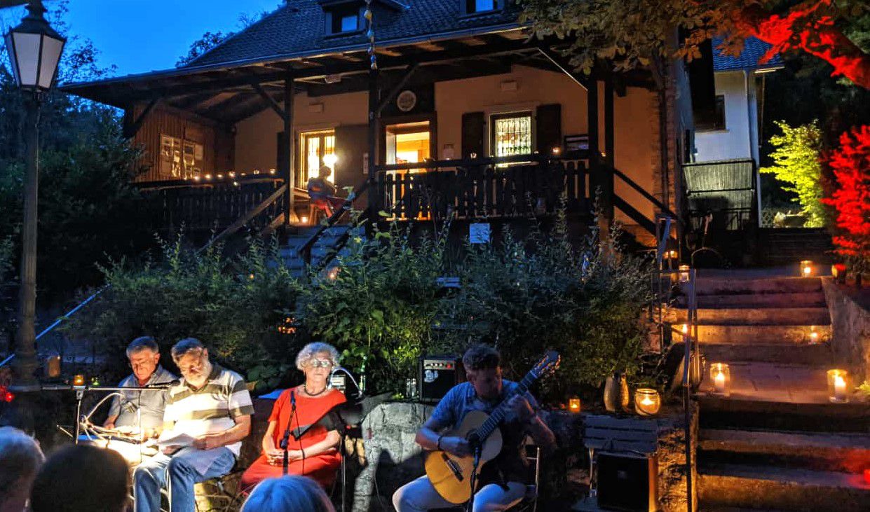 ab 19:30 Uhr Lesung mit Anne Hausknecht-Gülle im illuminierten Garten des NaturFreunde-Hauses mit besonderem kulinarischen Angebot. Die Texte stehen unter dem Thema: „Gelesene Worte zu erlesenen Wein“ und werden musikalisch begleitet von dem Gitarristen Oliver Thedieck.