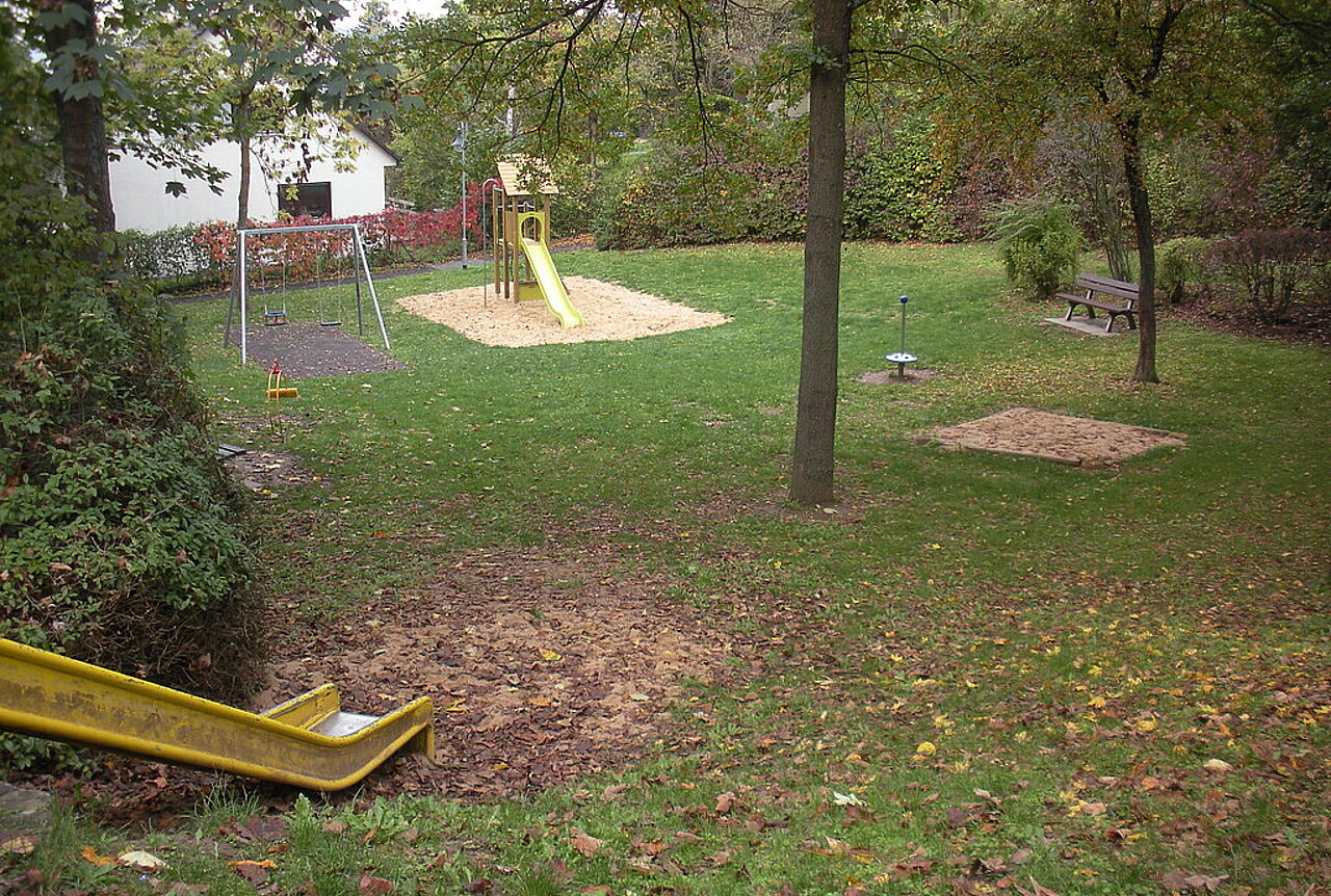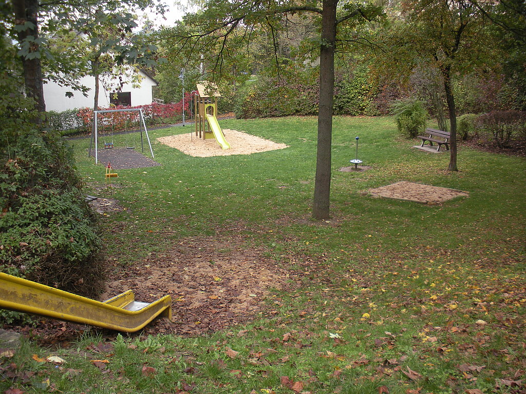 - Spielgeräte: Doppelschaukel, Drehgerät (Wirbel), Federwippgerät, Klettergerät mit Rutsche, Sandfläche, Hangrutsche, Grünfläche
