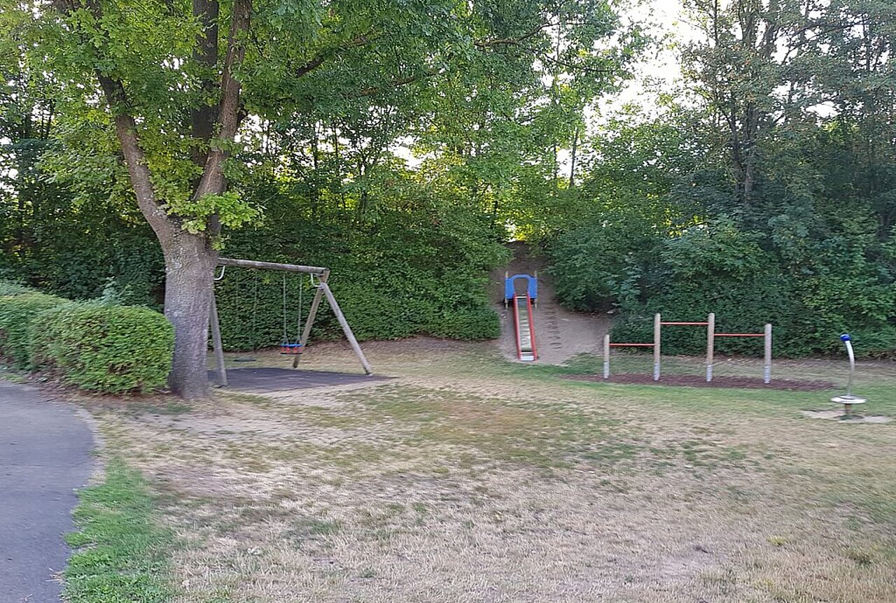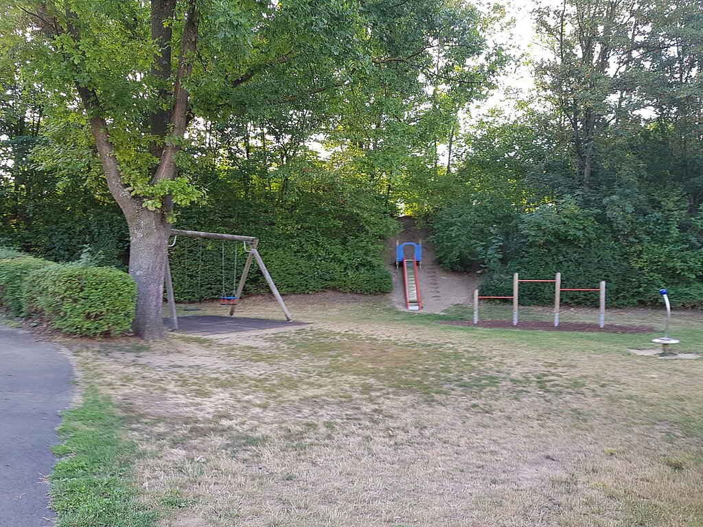 - Spielgeräte: Doppelschaukel, Stufenreck, Hangrutsche, Klettersechseck, Seilbaum, Drehgerät (Wirbel), Sandfläche, Grünfläche