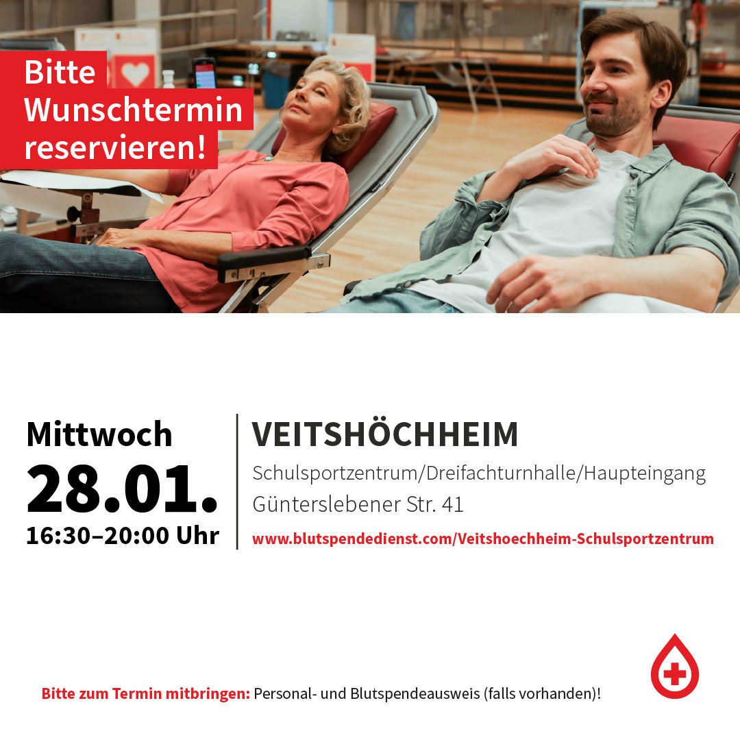 Der nächste Blutspendetermin findet am 28.01.2026 von 16:30 bis 20 Uhr im Schulsportzentrum/Dreifachturnhalle statt.