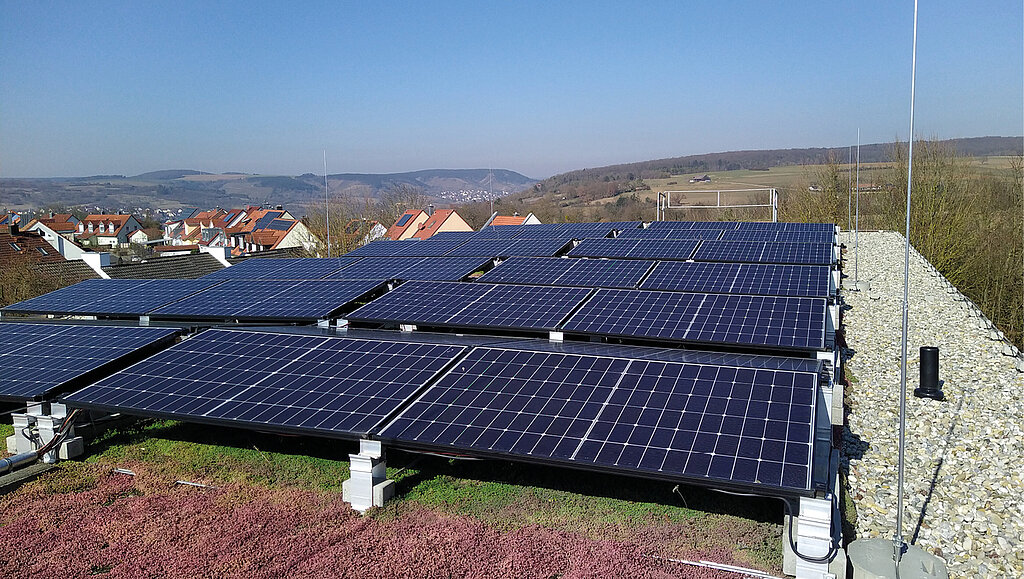 Für eine Kombination aus Gründach und PV-Anlage hat sich die Gemeinde Veitshöchheim auf dem Anbau Kuratiekindergarten entschieden. Ein perfektes Zusammenspiel: Das extensive Gründach kühlt PV-Anlage und Gebäude, speichert Regenwasser und fördert die Artenvielfalt. Die PV-Anlage versorgt den Kindergarten mit grüner Energie. Die 48 Module haben einer Leistung von ca. 18,4 kWp. Etwa 70-80% des Stroms sollen im Kindergarten selbst verbraucht werden, der Rest wird ins öffentliche Netz eingespeist. Aus technischen Gründen können die Anlagenerträge gegenwärtig noch nicht hier als Link eingebunden werden.